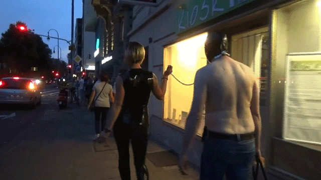 In this video you see Miss Cheyenne walking through downtown Cologne with a slave. For the slave it is the first time. The career of the slave begins on the Cologne City. On the way to porn cinema the slave has to endure many humiliations. Miss Cheyenne, of course, enjoys his embarrassment. You see and hear passers-by commenting. A man talks from his car: Yes mistress kick him in the balls! Miss Cheyenne answers: YOU BIRD CAN ALSO COME !!!